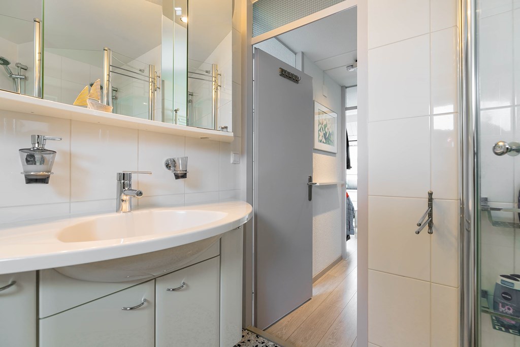 De badkamer is voorzien van een douchecabine, ligbad, toilet, wastafel met meubel en een designradiator. Ook is de badkamer voorzien van een raampje, hierdoor kan frisse lucht en licht de badkamer binnentreden.