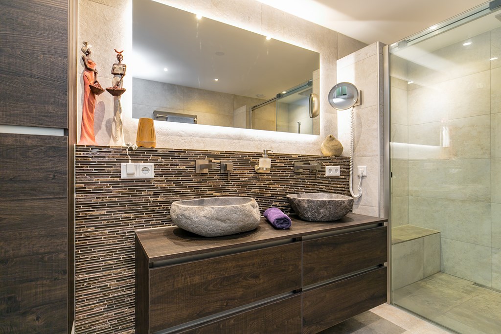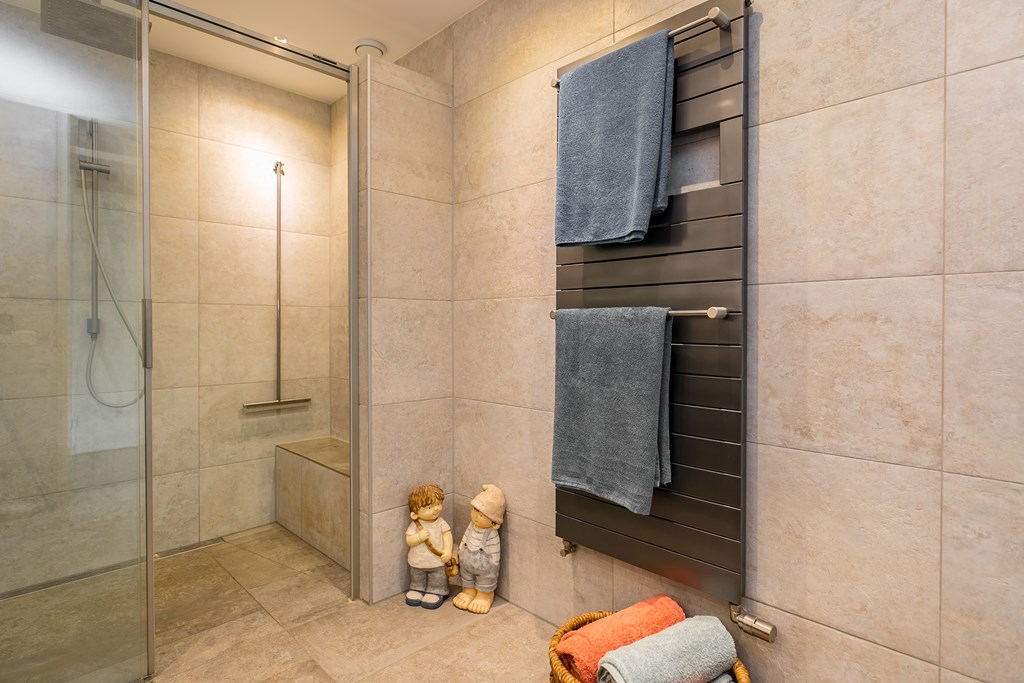 Via de hal zijn twee toiletruimten terug te vinden; één voor de gasten en dichterbij de slaapkamers één voor eigen gebruik. Deze toiletruimten zijn in 2019 compleet vernieuwd en luxe afgewerkt. De ruimten zijn voorzien van een wandcloset, inbouwunit voor reserve toiletrollen, fonteintje (in toiletruimte voor de gasten). Naast de vernieuwde toiletruimten, is ook de badkamer in 2019 compleet vernieuwd. Dankzij deze verbouwing is een luxe badkamer verkregen met een heuse sauna-uitstraling. Een groot voordeel is dat het toilet separaat is gebouwd, waardoor de badkamer alleen ruimte biedt aan het wastafelmeubel bestaande uit 2 separate uitgeholde rotsen en uiteraard het meubel met 4 grote laden en grote spiegel met ingebouwde verlichting en verwarming, een luxe make-up/scheerspiegel inclusief verlichting en de zeer ruime inloopdouche. Deze inloopdouche is voorzien van een handdouche en een regendouche welke bediend worden door de ingebouwde thermostaatkraan, bankjes aan weerszijden en nisjes in de wand voor het plaatsen van doucheschuim of shampoo. Mechanische ventilatie zorgt voor de ventilatie voor, tijdens en na het douchen.