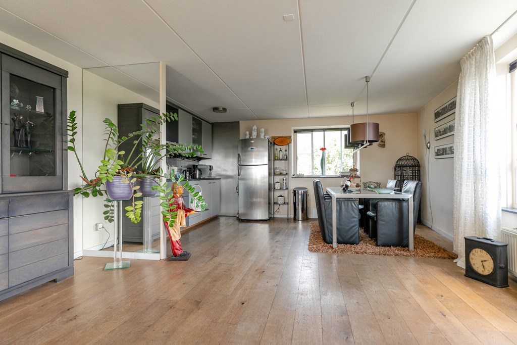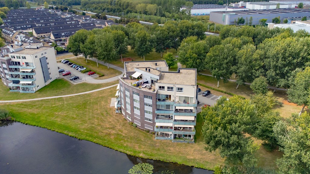 Bij binnenkomst in de hal heb je toegang tot de zeer ruime woonkamer, twee grote slaapkamers, badkamer, twee (!) toiletruimten, de meterkast en de wasruimte/berging. Bij het betreden van de woonkamer valt direct op dat er veel daglicht binnenkomt. Daarnaast is de woonkamer zeer riant te noemen en is er mogelijkheid voor een extra zitruimte met extra hoog plafond. Via de grote schuifpui is de toegang tot het zeer ruime dakterras (ca. 46 m²) te vinden. Dit dakterras is in 2020 voorzien van nieuwe dakbedekking en nieuwe tegels, waardoor er een extra luxe uitstraling is verkregen. Vanwege de grootte is er voldoende ruimte voor een uitgebreide loungeset, een hangmat en diverse plantenpotten. De borstwering is hoog genoeg om niet in de kijker te zitten waardoor privacy gewaarborgd is, maar als u gaat staan heeft u het prachtige uitzicht over de waterpartij en de wijk. Gaan we terug de woonkamer in, komen we via het zit- en eetgedeelte in de open keuken met diverse inbouwapparatuur (o.a. vaatwasser (Bosch – 2020) en kookplaat (Siemens – 2020) ) terecht. Ook aan deze zijde zijn raampartijen terug te vinden waardoor ook de keuken voldoende daglicht binnen krijgt. Het gehele penthouse, m.u.v. de slaapkamers en sanitaire ruimten, is voorzien van een eikenhouten vloer.