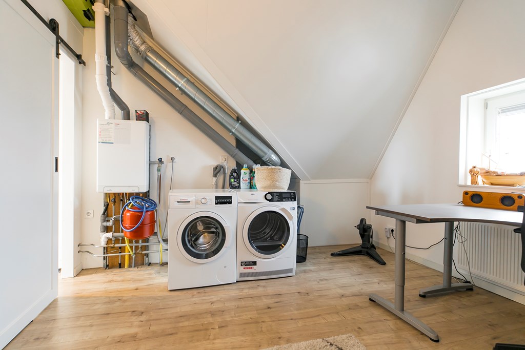 Deze verdieping is zeer ruim, mede door de dakkapel aan de achterzijde en de topgevel aan de voorkant. Er zijn 2 zeer ruime kamers gecreëerd en er is nog bergruimte aanwezig op de vliering. De slaapkamer aan de voorkant is op dit moment in gebruik als wasruimte en thuiswerkplek. Door het afscheiden van het was gedeelte is hier een waardige slaapkamer van te maken. De slaapkamer aan de achterkant is zeer prettige ruim en licht. Achter de knieschotten is nog extra bergruimte aanwezig.